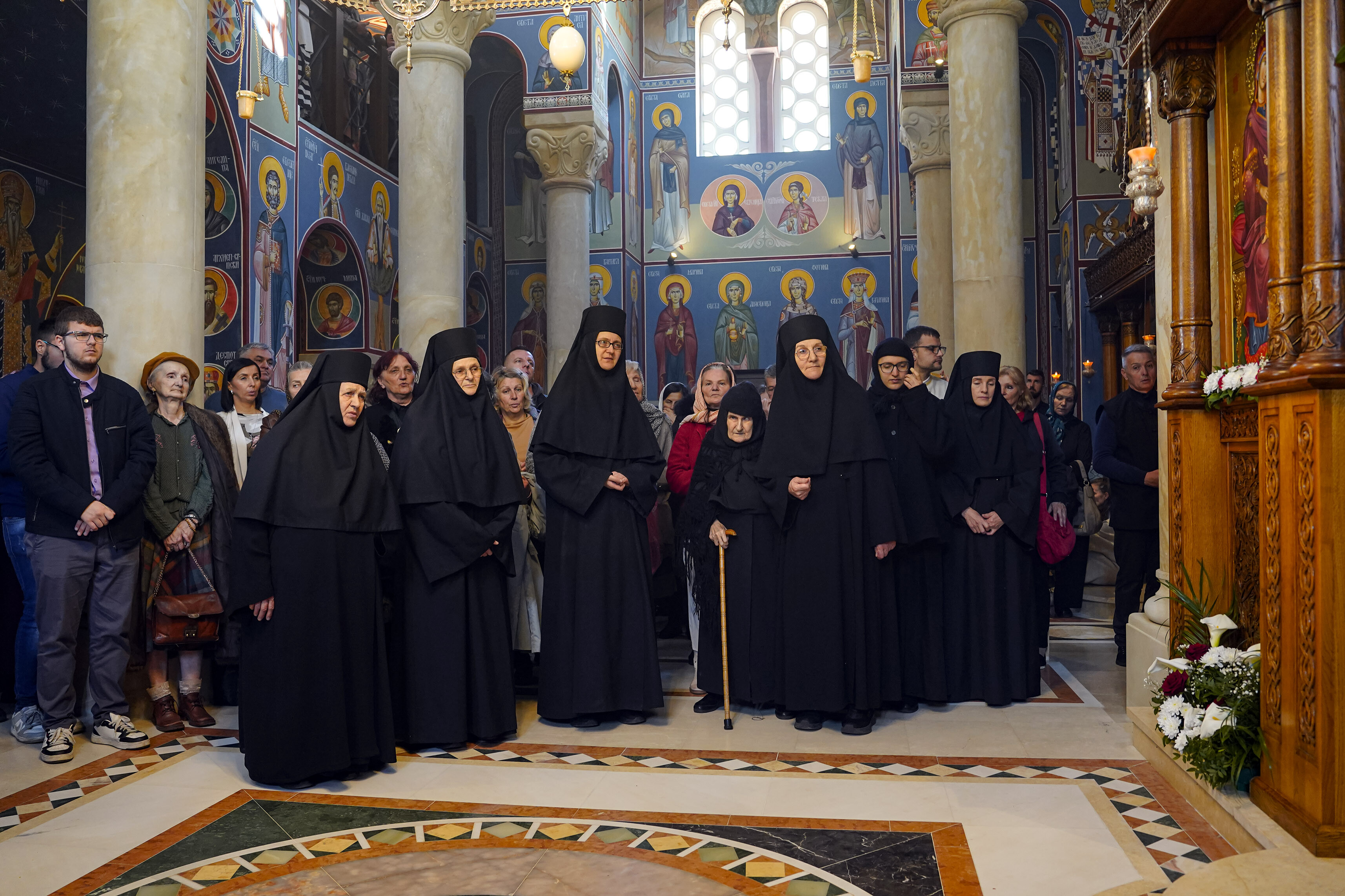 Он (Отац Јустин) је и за време страдања и после ратова у тешком времену писао и отворио перспективе за богословље наше Цркве. За њим су кренули многи његови ученици, они који су се на њих и Преподобног Јустина угледали и, после толико векова тешкоће, теологија се проучава захваљујући томе што је Преподобни Отац Јустин уложио труд и рад. Рођен на Благовести, упокојио се на Благовести- каква радост и лепота! Какав знак Божји! Дакле, свако време рађа људе који треба да допуњавају оно што треба телу Христовом тј.Цркви. Радујемо се данас са Преподобним Јустином Ћелијским, који је прибројан светима. Он је заједно ту са нама- беседио је Епископ Тихон у част једног од највећих православних молитвеника, проповедника и научника новог времена, чије нас молитве чувају из древне ћелијске светиње.