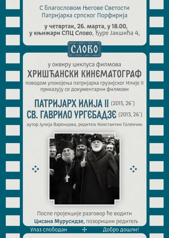 У четвртак, 25. марта 2026. године, у књижари Слово (Ђуре Јакшића 4) са почетком у 18 часова, поводом упокојења Католикоса-Патријарха Тбилисија и све Грузије Илије II биће приказани документарни филмови „Патријарх Илија II“ (2015, 26`) и „Свети Гаврило Ургебадзе“ (2013, 26`); аутор Јулија Варенцова, редитељ Константин Голенчик.