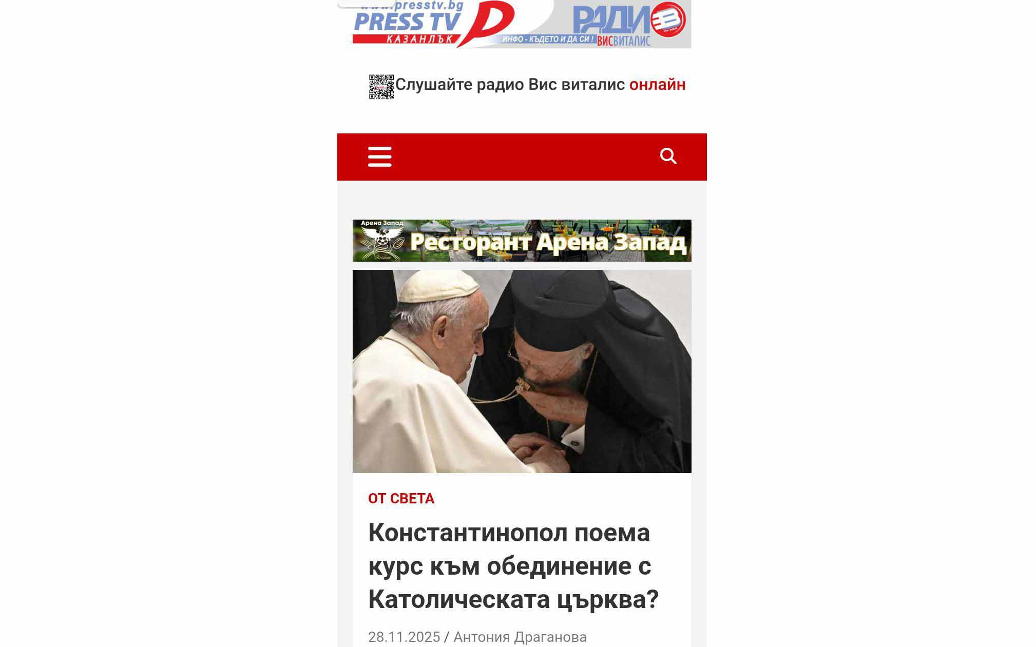 У контексту посете римског папе Лава Турској, где се састаје са патријархом Вартоломејем, бугарски медији су објавили чланак са нашег портала о кретању Константинопољске патријаршије ка унији са Римом.