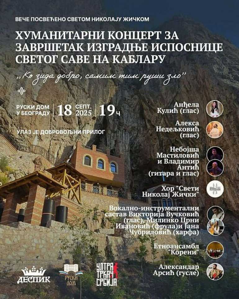У Руском дому у Београду, вечерас (ЖЦ: писано 17-ог) у 19.00 друштво "Деспик - Чувари корена" организује добротворни концерт српске духовне музике посвећене Светом Николају Жичком. Сврха концерта је прикупљање средстава за завршетак изградње Ћелије Светог Саве на Каблару.