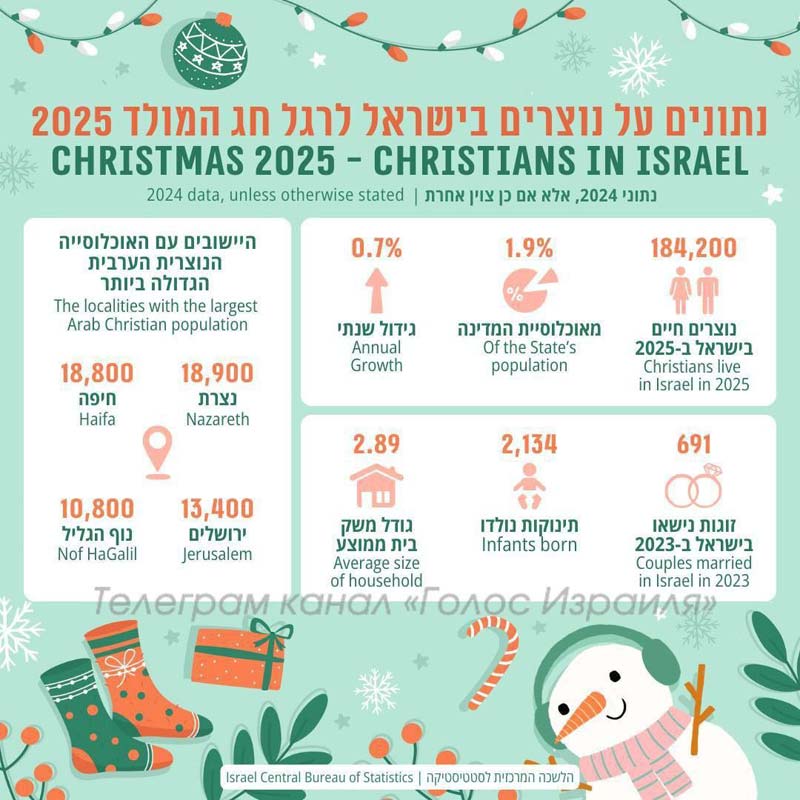 Централни завод за статистику Израела је уочи 2026. године објавио податке о хришћанском становништву Израела. Тренутно у земљи живи око 184 хиљаде хришћана – они чине око 1,9% становништва Израела.