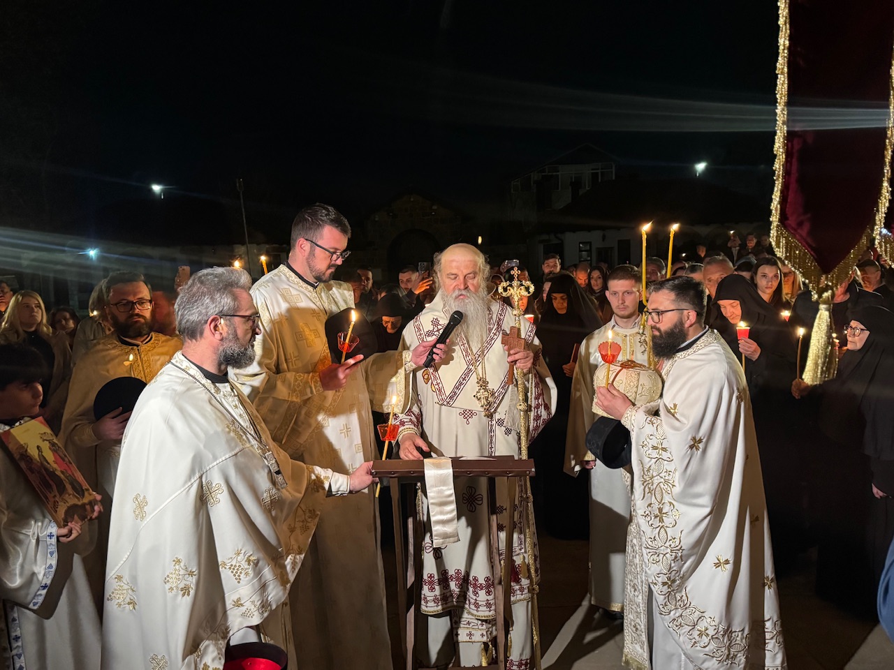 Више од хиљаду људи сабрало се у овој древној светињи да у молитви дочека најрадоснији хришћански празник. Тачно у поноћ, након опхода око храма, објављена је радосна вест – „Христос васкрсе!“, на шта су сабрани верници одговорили – „Ваистину васкрсе!“.