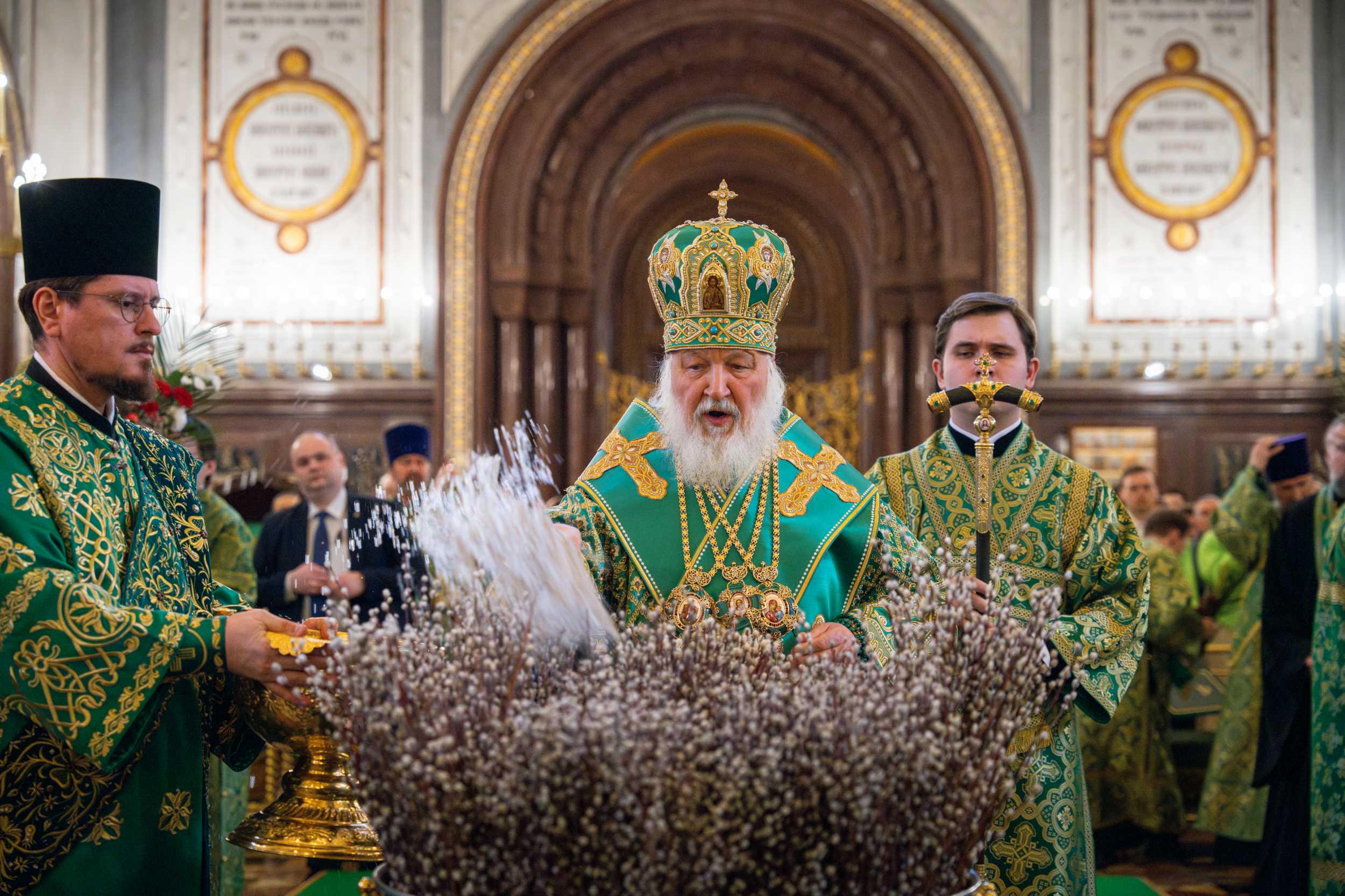 Након читања Јеванђеља, патријарх је извршио традиционално освећење врбових и палмових гранчица, а потом се поклонио чудотворним иконама Владимирске и Донске Богородице.