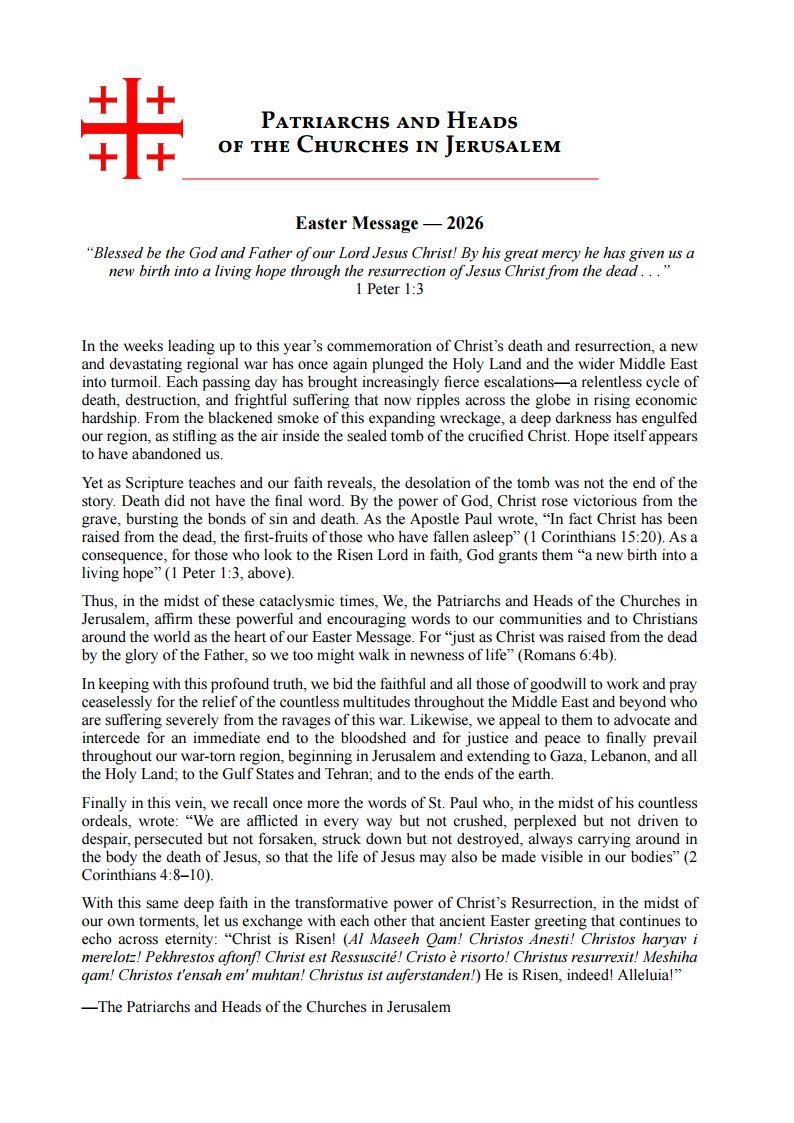 Стога, у овим катаклизмичним временима, ми, Патријарх и поглавари Цркава у Јерусалиму, потврђујемо ове снажне и охрабрујуће речи нашим заједницама и хришћанима широм света као срж наше васкршње посланице. Јер „као што Христос устаде из мртвих славом Очевом, тако и ми да ходимо у новом животу“ (Рим 6, 4).