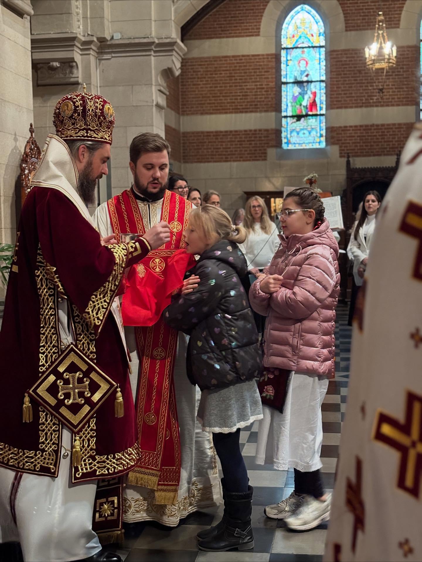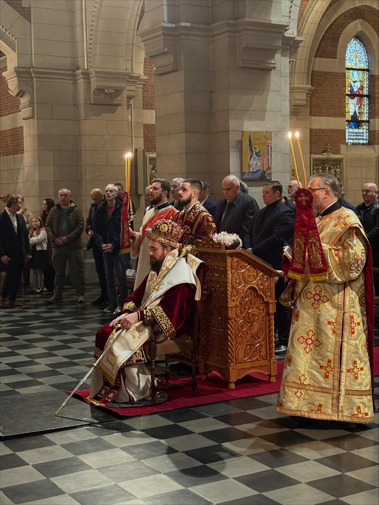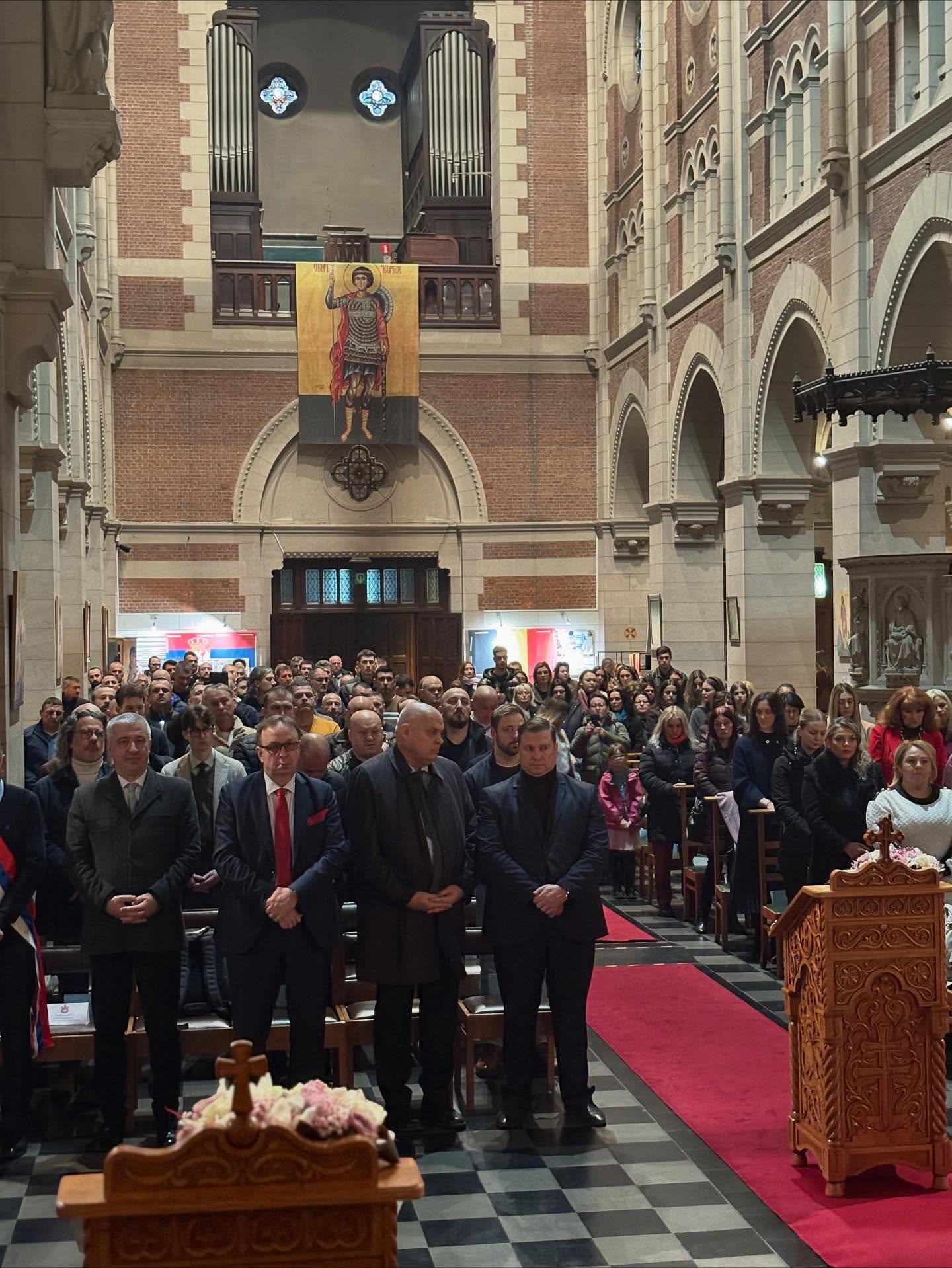 Саслуживало је више свештеника и ђакона из Епархије западноевропске уз молитвено учешће верног народа Божјег и присуство дипломата Републике Србије. После свете Литургије епископ Јустин је благосиљао славски колач и дарове принесене у славу и част Светог великомученика Георгија. Домаћини славе су приредили са пуно љубави богату славску трпезу и културно-уметнички програм који су извели полазници Српске допунске школе и најмлађи чланови КУД Ђурђевак из Антверпена.