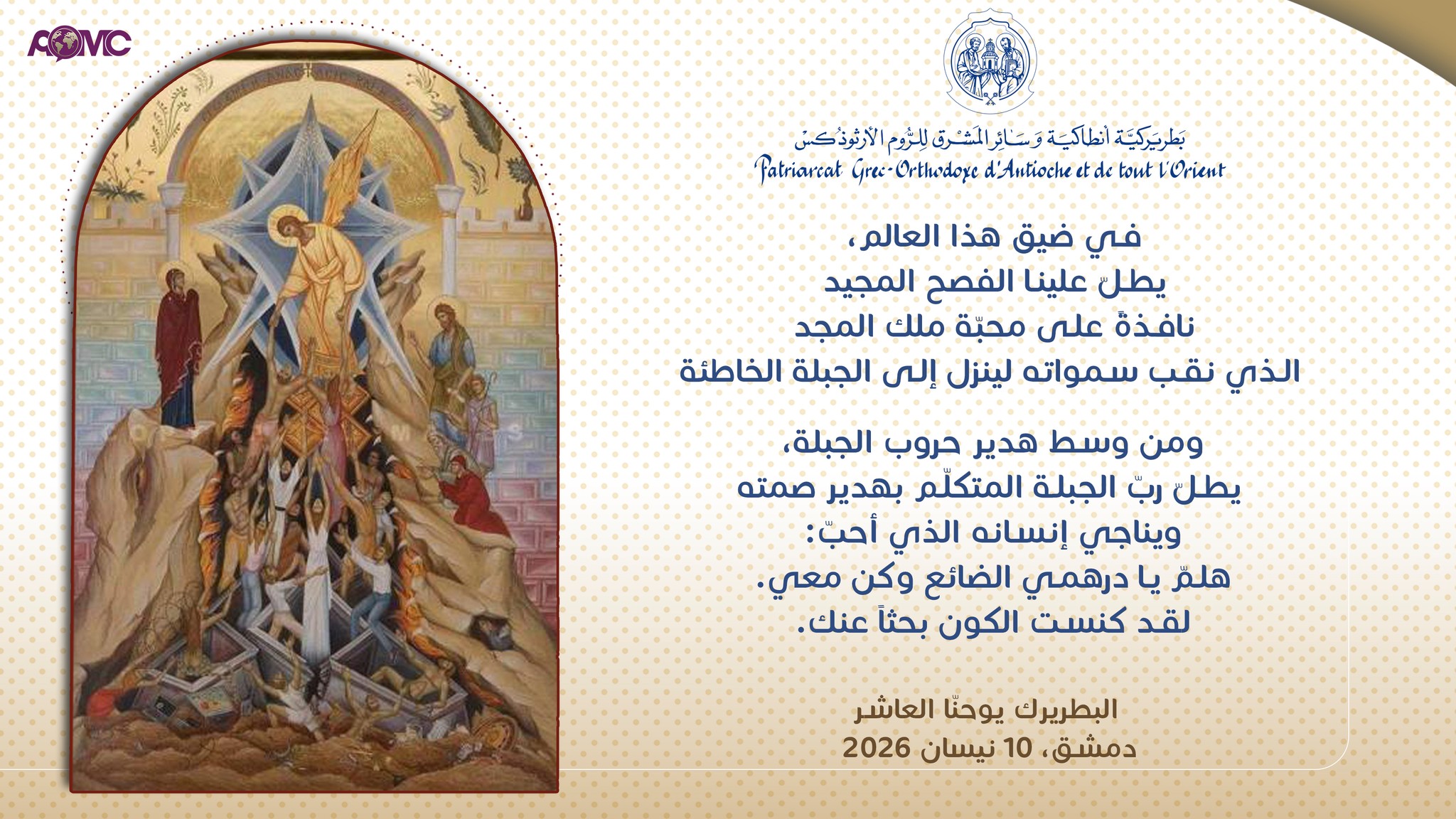 На дан свете Крсне Жртве, почетка пута ка Васкрсењу, сећамо се свих који живе у распећу. Молимо се за отете, међу њима и за нашу браћу, митрополите алепске — Јована Ибрахима и Павла Јазигија — који су већ тринаест година у заробљеништву. Молимо се за мученике храма Светог Илије у насељу Двејла, у граду Дамаску, и призивамо их да са висине посредују за нас. Молимо се да Бог удаљи од света Свога несреће ратова, које рађа гордост људска, и да исцели срца и душе благим мелемом мира Свога. Иштемо Божанску милост и Царство небеско за сву нашу браћу и ближње који нас претекоше у нади Васкрсења и живота вечнога, ка обитељи свете светлости Његове.